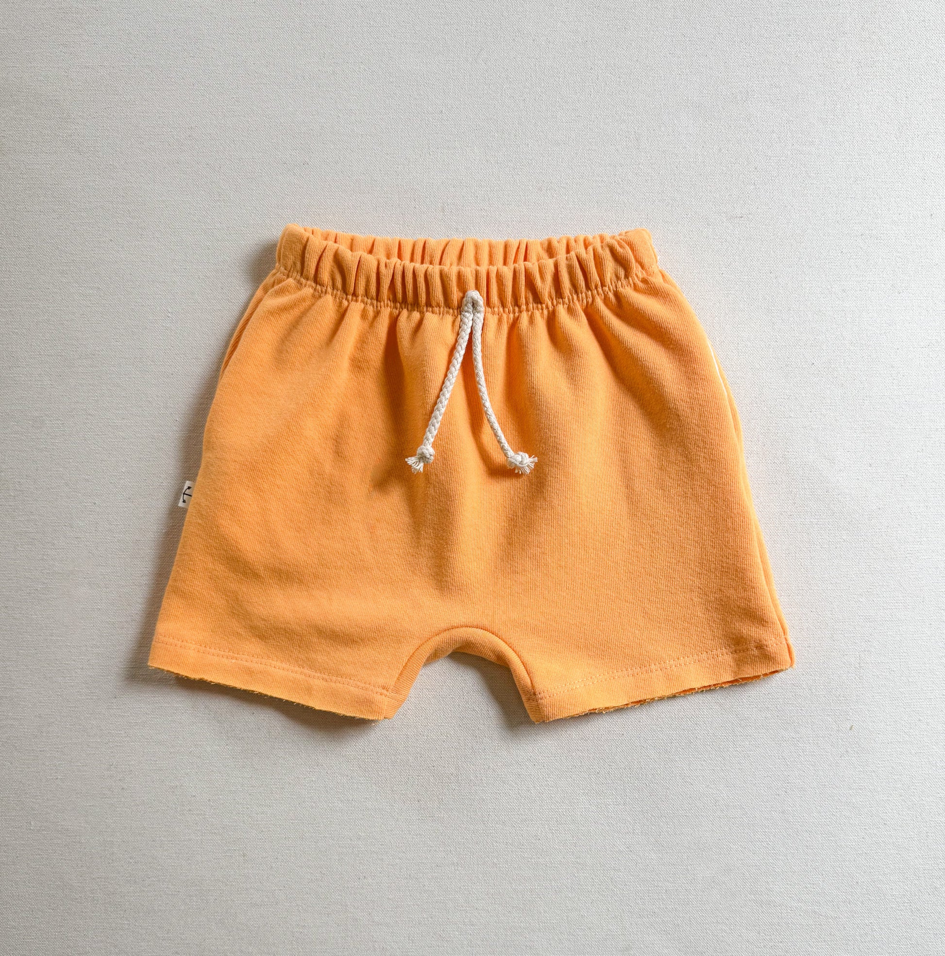 Our ORIGINAL mango is back in a super limited quantity! This is a vibrant peachy orange unlike any other! Featuring organic cotton jersey pockets, a raw edge hem and faux drawstring. Pre-laundered & pre-shrunk for ultra comfort.