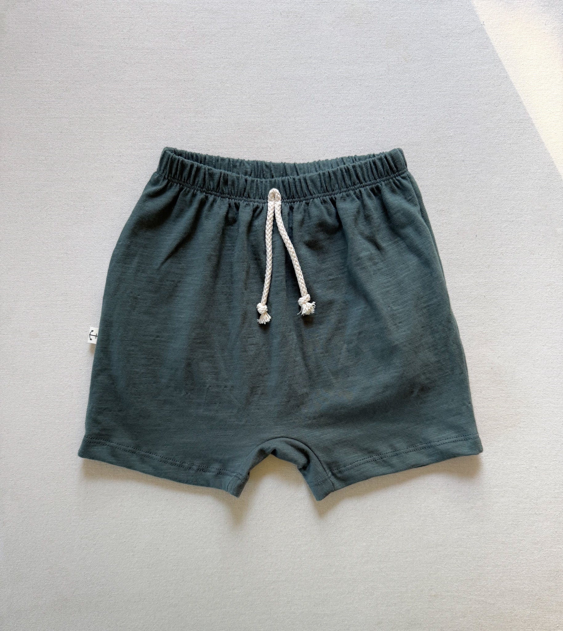 Northwood is a dark sage green. Our slub jersey boy shorts are made of a 100% organic cotton soft slub jersey that is soft yet durable. Perfect for the hottest summer days and so comfy, your babes won't want to take them off! Featuring organic cotton jersey pockets and a natural braided cotton faux drawstring and hemmed edge.