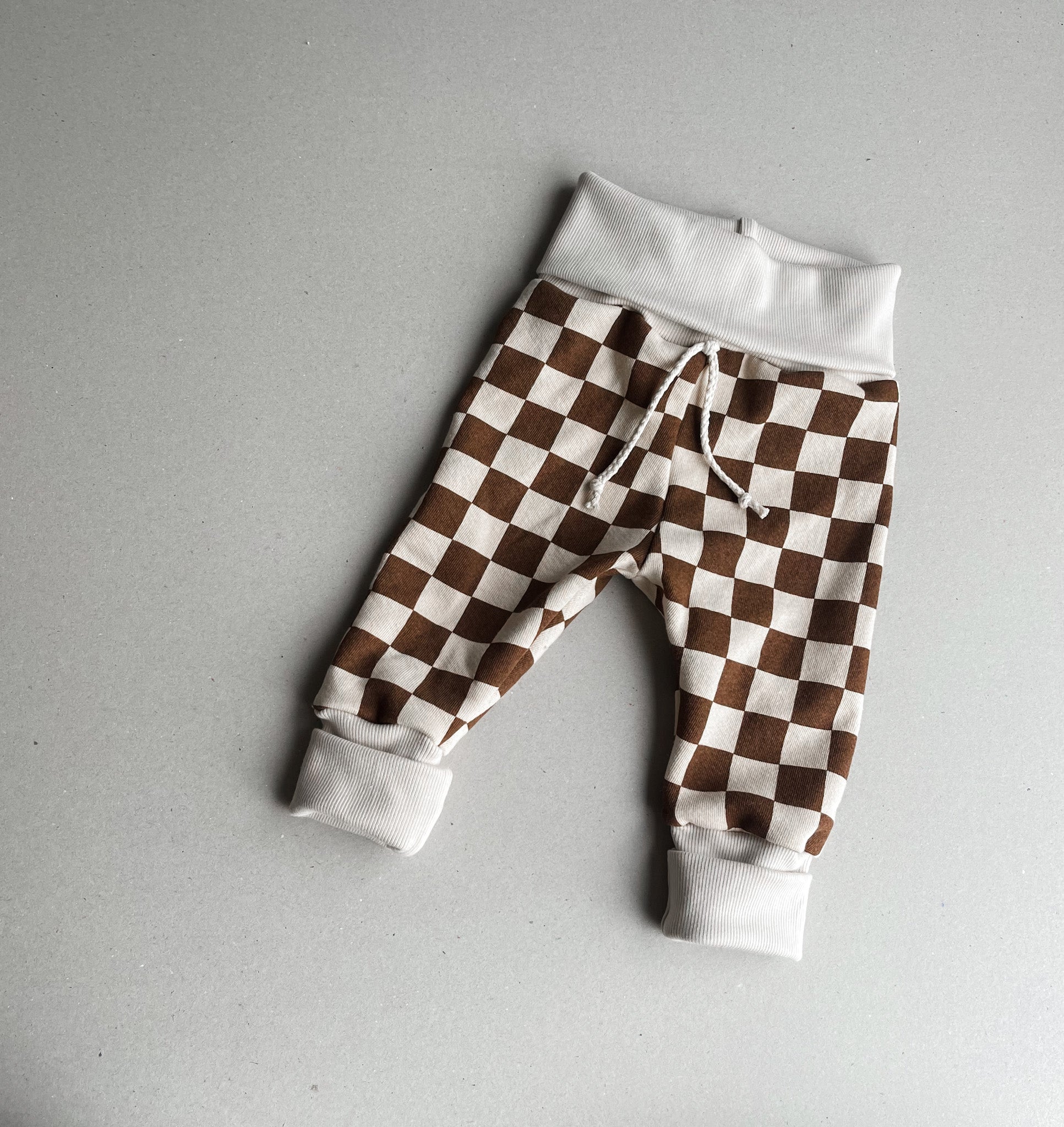 Coco + Sand is a brown and light tan check print french terry, made of 100% organic cotton. A relaxed fit with optional fold over waistband & cuffs. Pre laundered and preshrunk for ultra comfort.